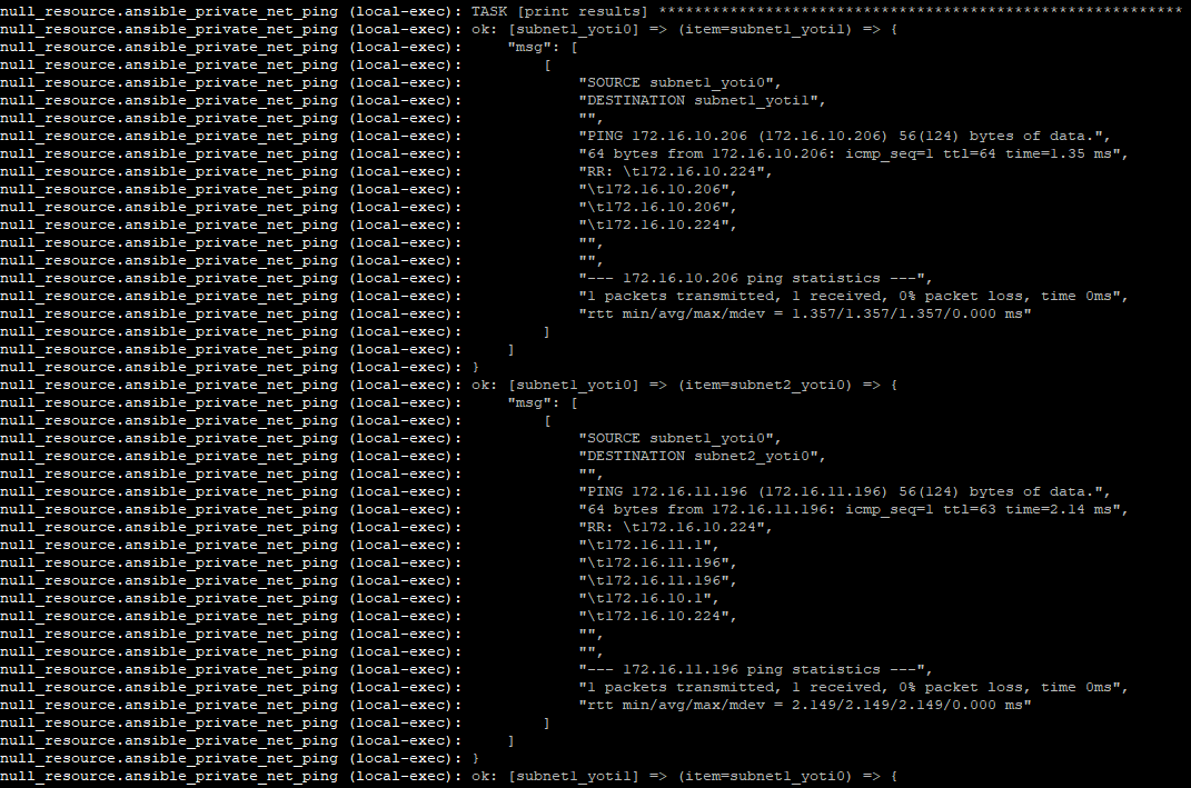 Once the Instances are live, Terraform will invoke an Ansible playbook to ping test between each node, the traffic route is displayed and shows traversal across the virtual router between networks.